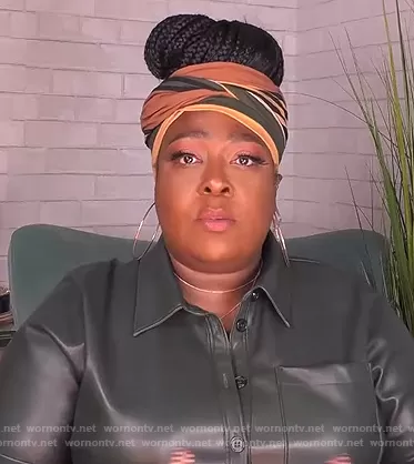 Loni Love on The Real on BETher was spotted wearing this green leather shirtdress on The Real on Feb 07 2021's episode. Loni's Dress is the Faux Leather Trench Dress by Eloquii.