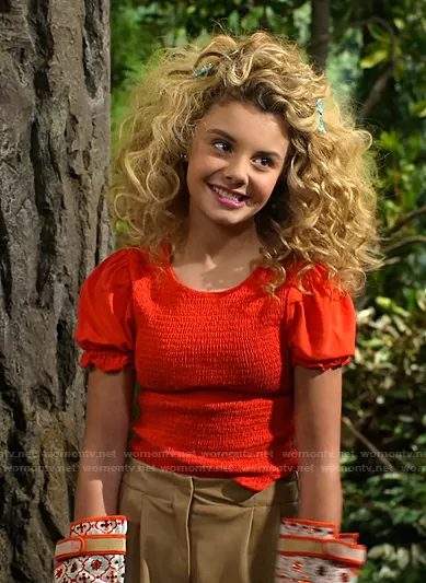 Destiny Baker (played by Mallory James Mahoney) on Bunkd on Disney was spotted wearing this red smocked top and faux leather shorts on Bunkd on episode 'Tentacle Difficulties' (5x04) in Feb 2021. Destiny's Top is the Smocked Ruffled Top by Forever 21.