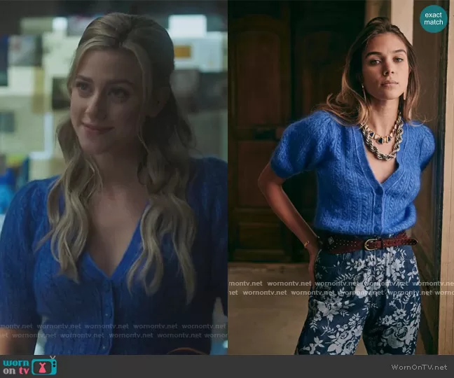 Betty Cooper (played by Lili Reinhart) on Riverdale on The CW was spotted wearing this blue knit crop cardigan on Riverdale on episode 'Purgatory' (5x04) in Feb 2021. Betty's Sweater is the Perrine Jumper by Sezane .