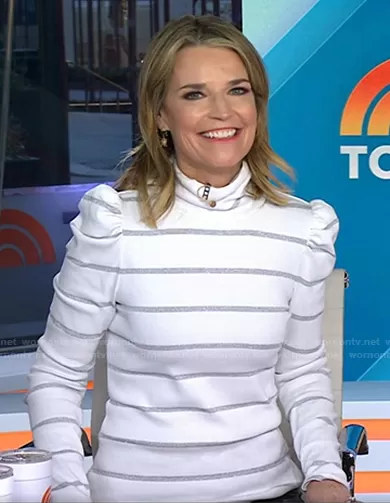 Savannah Guthrie on Today on NBC was spotted wearing this white striped turtleneck sweater on Today on Feb 11 2022's episode. Savannah's Sweater is the Cedar Turtleneck by Veronica Beard.