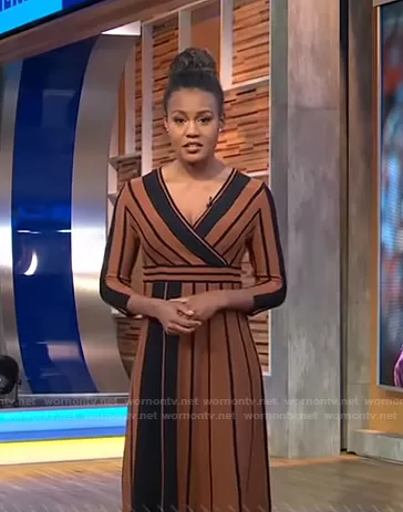 Janai Norman on Good Morning America on ABC was spotted wearing this brown striped midi dress on Good Morning America on Feb 16 2021's episode. Janai's Dress is the Stripe Surplice Neck Fit & Flare Dress by Nina Leonard.