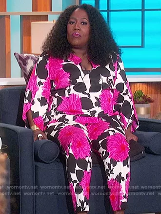 Sheryl Underwood on The Talk on CBS was spotted wearing this floral print top and pants on The Talk on Feb 16 2021's episode. Sheryl's Top is the Eternity Top by Trina Turk . Sheryl's Pants is the Larkin Pants by Trina Turk.