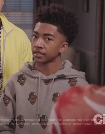 Jack Johnson (played by Miles Brown) on Black-ish on ABC was spotted wearing this gray Tupac print hoodie on Black-ish on episode 'High Water Mark' (7x12) in Feb 2021. Jack's Sweater is the Tupac Hoodie by Cross Colours.
