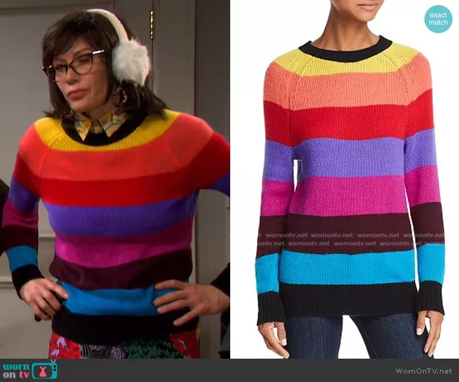 (played by ) on Days of our Lives on Peacock was spotted wearing this rainbow stripe sweater on Days of our Lives on Feb 17 2021's episode. 's Sweater is the Rainbow-Stripe Cashmere Sweater by Aqua Cashmere.