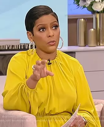 Tamron Hall on Tamron Hall Show on ABC was spotted wearing this yellow ruffle midi dress on Tamron Hall Show on Feb 17 2021's episode. Tamron's Dress is the Odette Dress by Ulla Johnson.