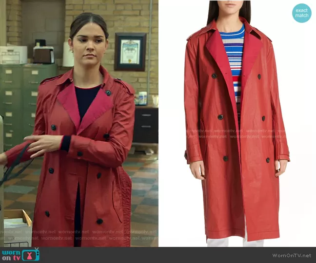 Callie Foster (played by Maia Mitchell) on Good Trouble on Freeform was spotted wearing this red trench coat on Good Trouble on episode 'Capoeira' (3x01) in Feb 2021. Callie's Coat is the Rufus Coated Cotton Trench Coat by rag & Bone.