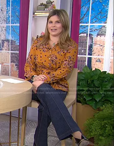 Jenna Bush Hager on Today on NBC was spotted wearing this orange floral blouse and flare jeans on Today on Feb 18 2021's episode. Jenna's Top is the Floral Crepe Belted Capelet Top by Pearl by Lela Rose . Jenna's Pants is the Stretch Denim Ruthie Pant by Pearl by Lela Rose.