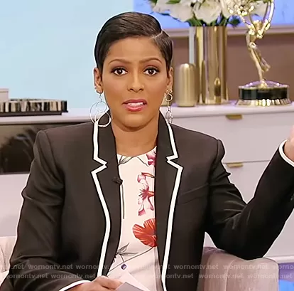 Tamron Hall on Tamron Hall Show on ABC was spotted wearing this floral top and black contrast trim blazer on Tamron Hall Show on Feb 18 2021's episode. Tamron's Top is the Floral Knit Tank by Oscar De La Renta . Tamron's Blazer is the Contrast-trim Single-breasted Blazer by Saint Laurent.