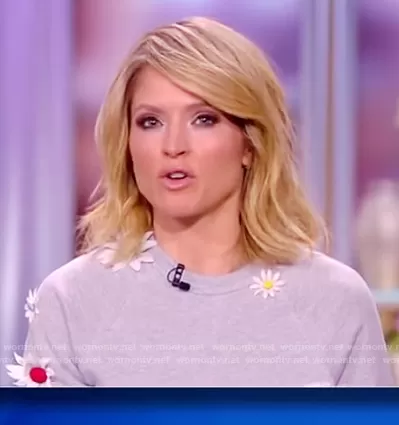 Sara Haines on The View on ABC was spotted wearing this gray floral applique sweatshirt on The View on Feb 18 2021's episode. Sara's Sweater is the Removable Daisies Sweatshirt by Rosie Assoulin.