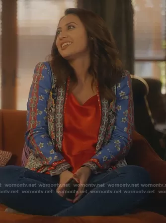 Ana Torres (played by Francia Raisa) on Grown-ish on Freeform was spotted wearing this mixed print blazer and satin top on Grown-ish on episode 'NO HALO' (3x13) in Feb 2021. Ana's Top is the Harmon Drapey Slip Tank by Alice + Olivia . Ana's Blazer is the Macey Mix Print Blazer by Alice + Olivia.
