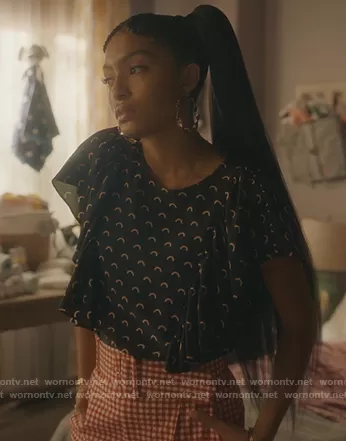 Zoey Johnson (played by Yara Shahidi) on Grown-ish on Freeform was spotted wearing this black rainbow print ruffle top on Grown-ish on episode 'NO HALO' (3x13) in Feb 2021. Zoey's Top is the Mini Rainbow Silk Ruffle Top by Opening Ceremony . Zoey's Shorts is the Gingham Shorts by Zara.