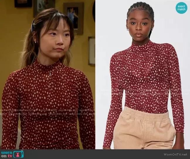 Jen (played by Krista Marie Yu) on Last Man Standing on Fox was spotted wearing this red dotted mock neck top on Last Man Standing on episode 'Lost and Found' (9x08) in Feb 2021. Jen's Top is the Sheer Spotted Print Top in Burgundy by Forever 21.