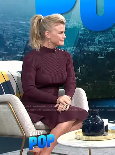 on E! News on E! was spotted wearing this burgundy ribbed dress on E! News Daily Pop on Feb 19 2021's episode. 's Dress is the Button Detail Long Sleeve Skater Dress by Ted Baker.