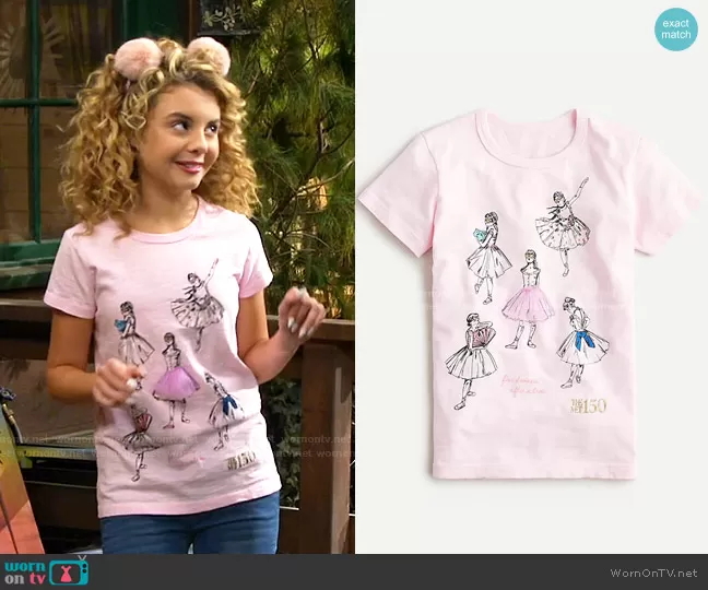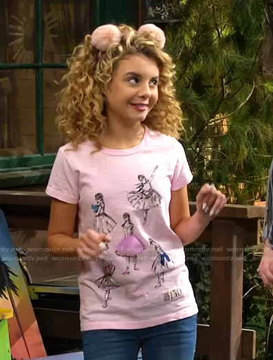 Destiny Baker (played by Mallory James Mahoney) on Bunkd on Disney was spotted wearing this pink ballerina print tee on Bunkd on episode 'Luck of the Chuck' (5x05) in Feb 2021. Destiny's Top is the The Met x Crewcuts Degas Ballerina T-Shirt by J. Crew.