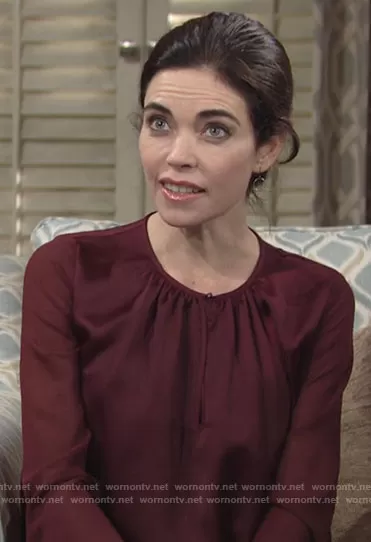 Victoria Newman (played by Amelia Heinle) on The Young and the Restless on CBS was spotted wearing this red keyhole blouse on The Young and the Restless on Feb 19 2021's episode. Victoria's Top is the Sheer and Opaque Blouse by Karen Millen.
