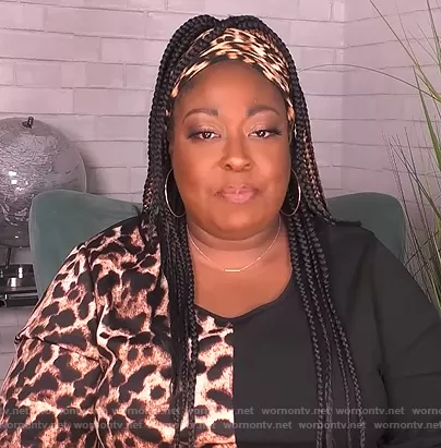 Loni Love on The Real on BETher was spotted wearing this leopard colorblock print dress on The Real on Feb 16 2021's episode. Loni's Dress is the Animal Print Colorblock Midi Dress by Ashley Stewart.