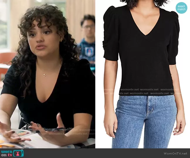 Maggie Vera (played by Sarah Jeffery) on Charmed on The CW was spotted wearing this black v-neck top and leopard print wrap skirt on Charmed on episode 'You Can't Touch This' (3x04) in Feb 2021. Maggie's Top is the Frankie Sweater by Frame . Maggie's Skirt is the Leopard Print Asymmetrical Denim Wrap Skirt by Ganni.