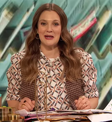 Drew Barrymore on The Drew Barrymore Show on CBS was spotted wearing this geometric tie neck blouse on The Drew Barrymore Show on Feb 22 2021's episode. Drew's Top is the Sany Printed Silk Blouse by Sandro.