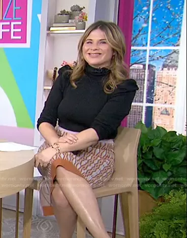 Jenna Bush Hager on Today on NBC was spotted wearing this black puff shoulder sweater and print knit skirt on Today on Feb 22 2021's episode. Jenna's Sweater is the Cedar Turtleneck Sweater by Veronica Beard . Jenna's Skirt is the Geena Skirt by Aknvas.