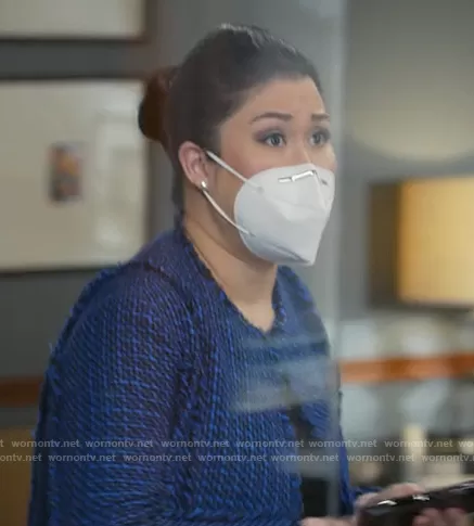 Sherri Kansky (played by Ruthie Ann Miles) on All Rise on OWN was spotted wearing this blue tweed jacket and skirt on All Rise on episode 'Safe to Fall' (2x09) in Feb 2021. Sherri's Jacket is the Johellana Fringe Tweed Cropped Jacket by BOSS . Sherri's Skirt is the Vomanda Tweed Suit Skirt by BOSS.