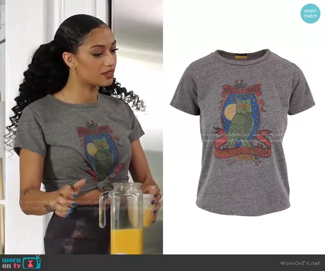 Olivia Baker (played by Samantha Logan) on All American on CWTV was spotted wearing this grey owl print tee on All American on episode 'Teenage Love' (3x06) in Feb 2021. Olivia's Top is the The Little Goodie Goodie Tee by Mother.