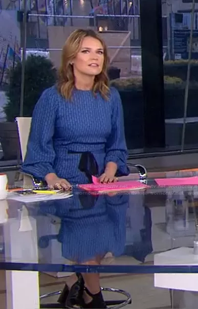 Savannah Guthrie on Today on NBC was spotted wearing this blue printed tie waist dress on Today on Dec 13 2021's episode. Savannah's Dress is the Selma Midi Dress by Cefinn.