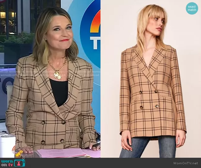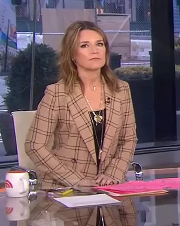 Savannah Guthrie on Today on NBC was spotted wearing this beige grid check blazer on Today on Apr 01 2024's episode. Savannah's Jacket is the Windsor Blazer by La Ligne . Savannah's Shoes is the Horsebit-Detailed Leather Ankle Boots by Gucci.
