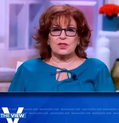 Joy Behar on The View on ABC was spotted wearing this teal tie neck blouse on The View on Feb 24 2021's episode. Joy's Top is the Izabel Blouse by Lafayette 148.