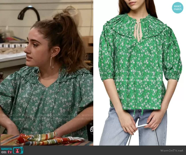 Jackie Raines (played by Rachel Sennott) on Call Your Mother on ABC was spotted wearing this green floral tie neck blouse on Call Your Mother on episode 'Sunday Dinner' (1x06) in Feb 2021. Jackie's Top is the Floral Pleated Bib Blouse by Topshop.