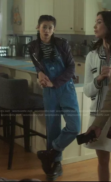 George Fan (played by Leah Lewis) on Nancy Drew on The CW was spotted wearing this denim overalls and leather jacket on Nancy Drew on episode 'The Riddle of the Broken Doll' (2x06) in Feb 2021. George's Overalls is the Vintage Overall by Levi's . George's Jacket is the Ashville Leather Jacket in Plum by Iro . George's Shoes is the Jadon Boot by Dr. Martens.