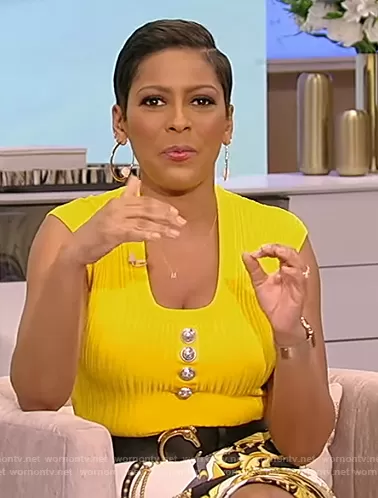 Tamron Hall on Tamron Hall Show on ABC was spotted wearing this yellow button embellished top on Tamron Hall Show on Feb 25 2021's episode. Tamron's Top is the Button-embellished ribbed-knit top by Balmain.