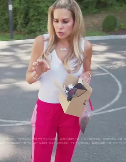 Jackie Goldschneider on The Real Housewives of New Jersey on Bravo was spotted wearing this pink side stripe track pants on The Real Housewives of New Jersey on episode 'Licked Up and Down' (11x02) in Feb 2021. Jackie's Pants is the Indira Wide Leg Track Pants by St Roche.
