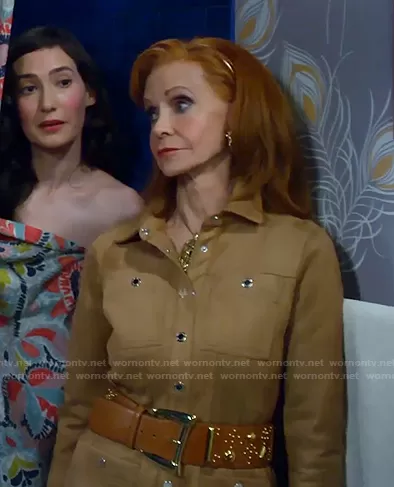 Sheila (played by Swoosie Kurtz) on Call Me Kat on Fox was spotted wearing this beige suede shirtdress on Call Me Kat on episode 'First Date' (1x09) in Feb 2021. Sheila's Dress is the Faux-Suede Shirt Dress by White House Black Market.