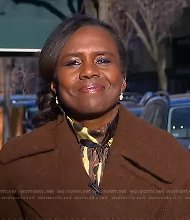 Deborah Roberts on Good Morning America on ABC was spotted wearing this yellow and brown printed blouse on Good Morning America on Oct 25 2023's episode. Deborah's Top is the Iris Print Silk Shirt by Dries Van Noten.