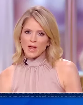 Sara Haines on The View on ABC was spotted wearing this sleeveless turtleneck top on The View on Feb 26 2021's episode. Sara's Top is the Lori Silk Halter Top by Ramy Brook.