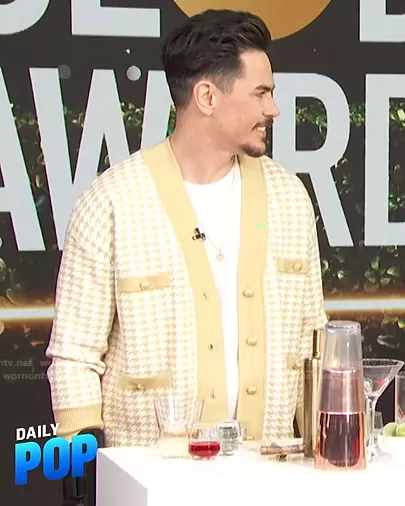 on E! News on E! was spotted wearing this yellow houndstooth cardigan on E! News Daily Pop on Mar 01 2021's episode. 's Coat is the Cardi Coat by Sandro.