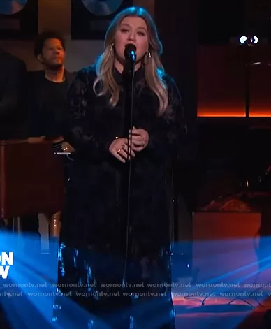 Kelly Clarkson on The Kelly Clarkson Show on NBC was spotted wearing this black lace long sleeve dress on The Kelly Clarkson Show on Mar 16 2021's episode. Kelly's Dress is the Pure Drama Maxi Dress by Joe Brown.