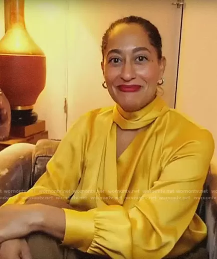 Oscar de la Renta Tie-neck draped satin-crepe blouse worn by Tracee Ellis Ross on CBS This Morning