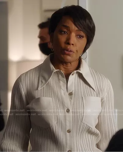 Athena Grant (played by Angela Bassett) on 9-1-1 on ABC was spotted wearing this white leather shirt on 9-1-1 on episode 'There Goes the Neighborhood' (4x07) in Mar 2021. Athena's Top is the Blaine Pleated Faux Leather Shirt by Nanushka.