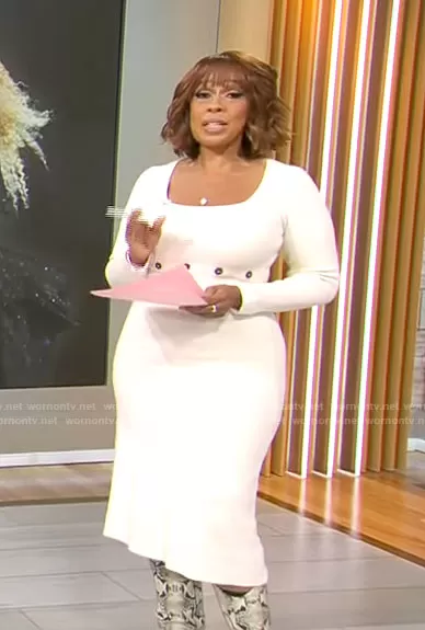 Gayle King on CBS Mornings on CBS was spotted wearing this white square neck knit dress on CBS Mornings on Feb 02 2023's episode. Gayle's Dress is the Knit Dress with Buttons by Zara.