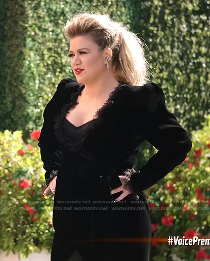 Kelly Clarkson on The Voice on NBC was spotted wearing this black lace trim velvet wrap dress on The Voice on Mar 02 2021's episode. Kelly C's Dress is the Lace-Trimmed Velvet Wrap Dress by Saint Laurent . Kelly C's Top is the Floral Lace Bustier Top by Dolce & Gabbana.