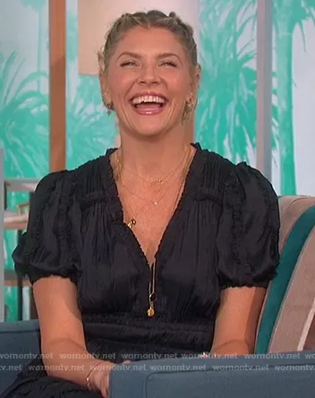 Amanda Kloots on The Talk on CBS was spotted wearing this navy ruffle dress on The Talk on Mar 03 2021's episode. Amanda's Dress is the Serena Ruffle Satin Long Sleeve Midi Dress by Ulla Johnson.
