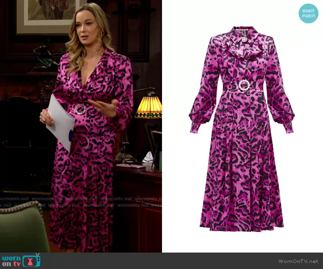 Donna Logan (played by Jennifer Gareis) on The Bold and the Beautiful on CBS was spotted wearing this pink leopard print midi dress on The Bold and the Beautiful on Mar 03 2021's episode. Donna's Dress is the Crystal Buckle Leopard Print Silk Midi Dress by Alessandra Rich .