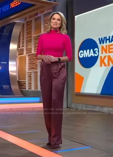 Amy Robach on Good Morning America on ABC was spotted wearing this pink sweater and satin pants on Good Morning America on Mar 03 2021's episode. Amy's Pants is the Alexi Satin Pants by Cinq a Sept . Amy's Earrings is the Love JW Large Hoop Earring by Jane Win.