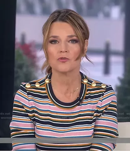 Savannah Guthrie on Today on NBC was spotted wearing this striped button-shoulder top on Today on Jan 10 2022's episode. Savannah's Top is the Mayer Button Shoulder Top by Veronica Beard.