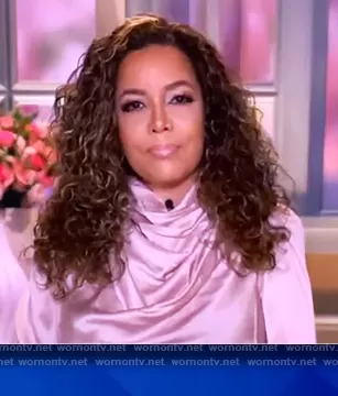 Sara Haines on The View on ABC was spotted wearing this pink drape satin blouse on The View on Mar 04 2021's episode. Sara's Top is the Satin Scarf-Neck Blouse by Lapointe.