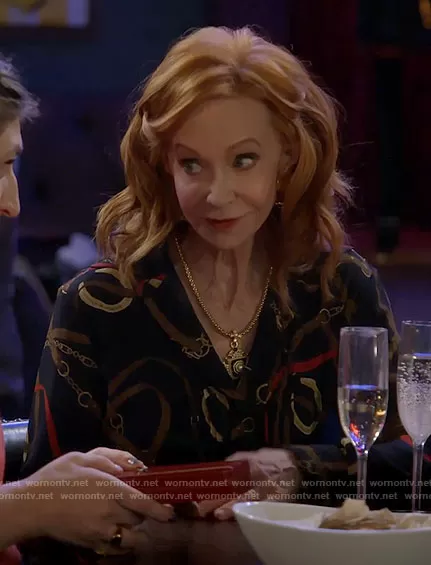 Sheila (played by Swoosie Kurtz) on Call Me Kat on Fox was spotted wearing this navy equestrian print dress on Call Me Kat on episode 'Business Council' (1x10) in Mar 2021. Sheila's Dress is the Printed Shirt Dress by LAUREN Ralph Lauren.
