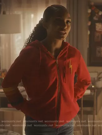 Zoey Johnson (played by Yara Shahidi) on Grown-ish on Freeform was spotted wearing this red lightning bolt hoodie on Grown-ish on episode 'Over My Head' (3x15) in Mar 2021. Zoey's Sweater is the Bolt Applique Hoodie by Aviator Nation.