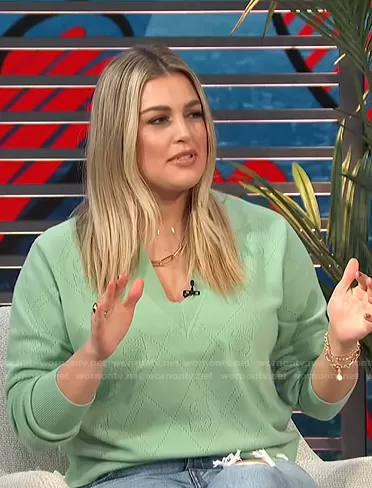 Carissa Loethen Culiner on E! News on E! was spotted wearing this green v-neck sweater on E! News Daily Pop on Mar 05 2021's episode. Carissa's Sweater is the V-Neck Wool & Cashmere Sweater by Sandro.