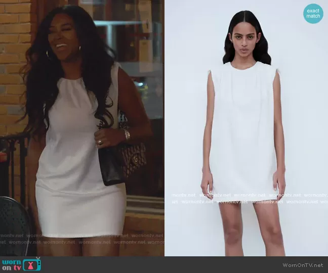 Kenya Moore on The Real Housewives of Atlanta on Bravo was spotted wearing this white sleeveless mini dress on The Real Housewives of Atlanta on episode 'Front Page News' (13x12) in Mar 2021. Kenya's Dress is the Flowy Dress with Shoulder Pads by Zara . Kenya's Shoes is the Demanding Fashion Boot by Steve Madden.